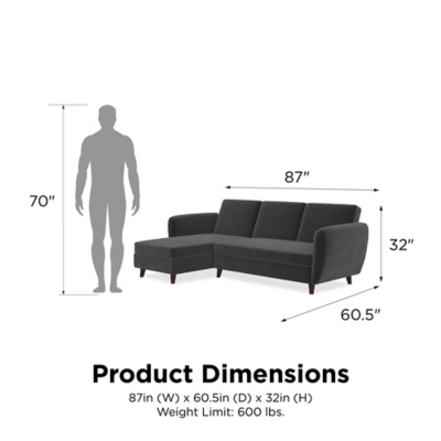 DescriptionThis space sectional futon is the perfect combination of chic style and functionality. Upholstered in soft velvet with bolster pillows and black tapered legs that enhance the aesthetic of this modern sectional futon. Designed with a sturdy wood frame, this sectional has an interchangeable chaise that can be placed on either side to accommodate the layout of your home. Its multi-positional split-back design allows you to independently recline the backrest between three positions: sitting, lounging and sleeping. No matter the occasion, this futon is the perfect addition to host family and friends for a movie night or accommodate unexpected overnight guests.