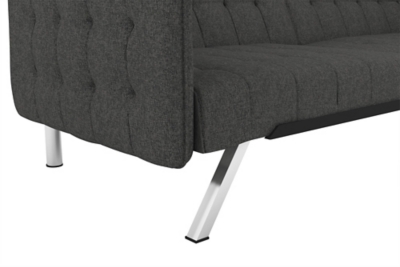 This futon sleeper is made with a gray linen upholstery, embellished with button-tufted details gracing the back/seat cushions and sheltering armrests. Offering a look of modern luxury, it features sleek chrome-tone legs that tie the whole look together. With a split-back design, this futon easily adjusts into three distinct positions: seating, lounging or sleeping. When you have an overnight guest, lower the backrest with just one push or pull. No guest bedroom? No problem.- Sturdy wood frame